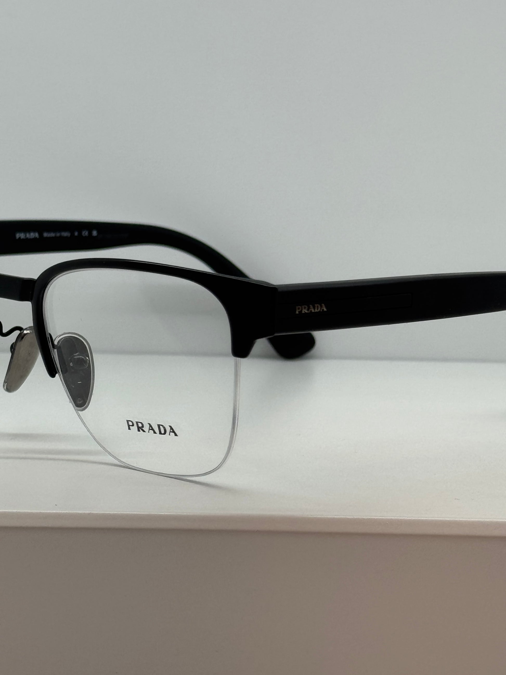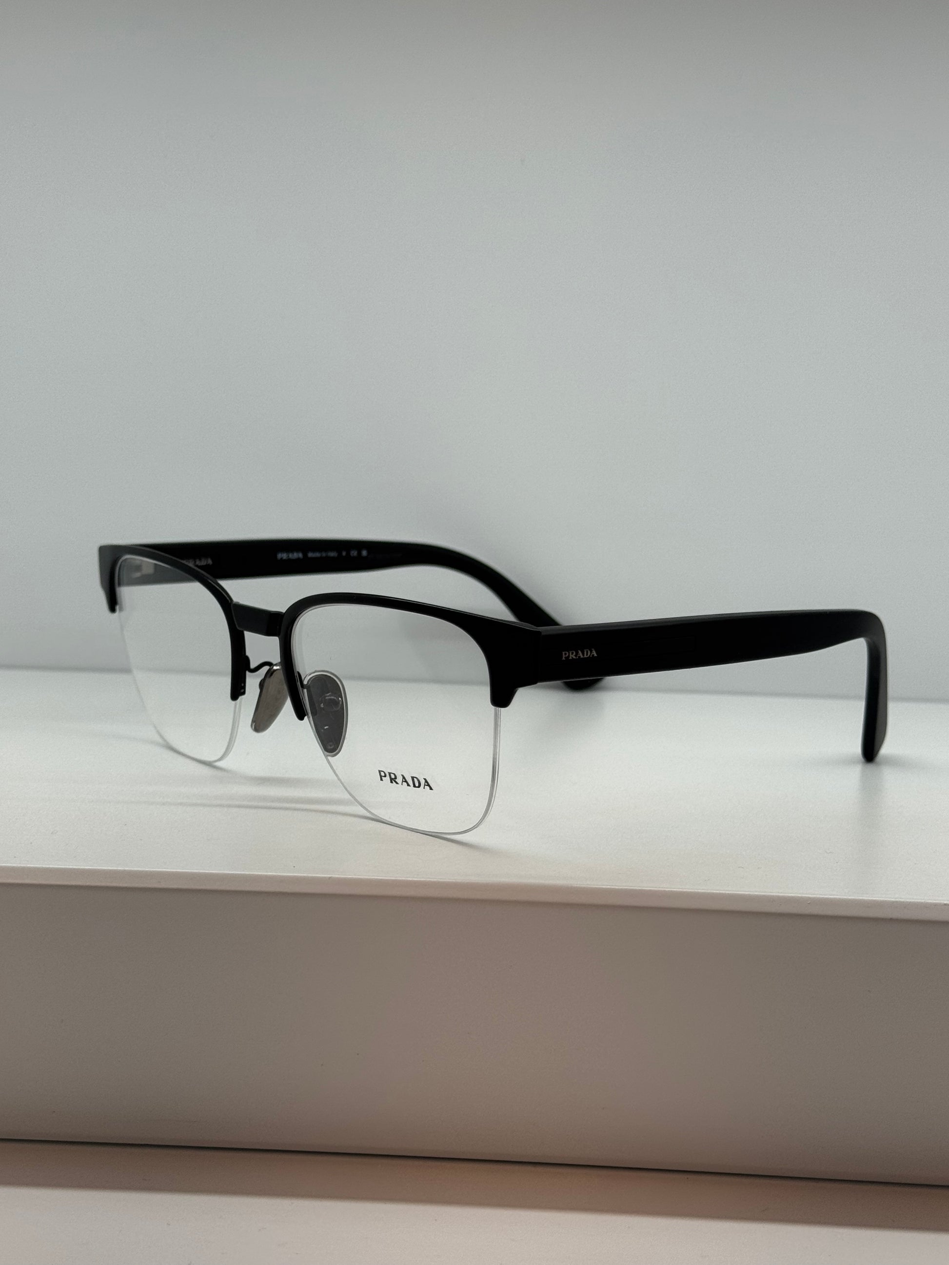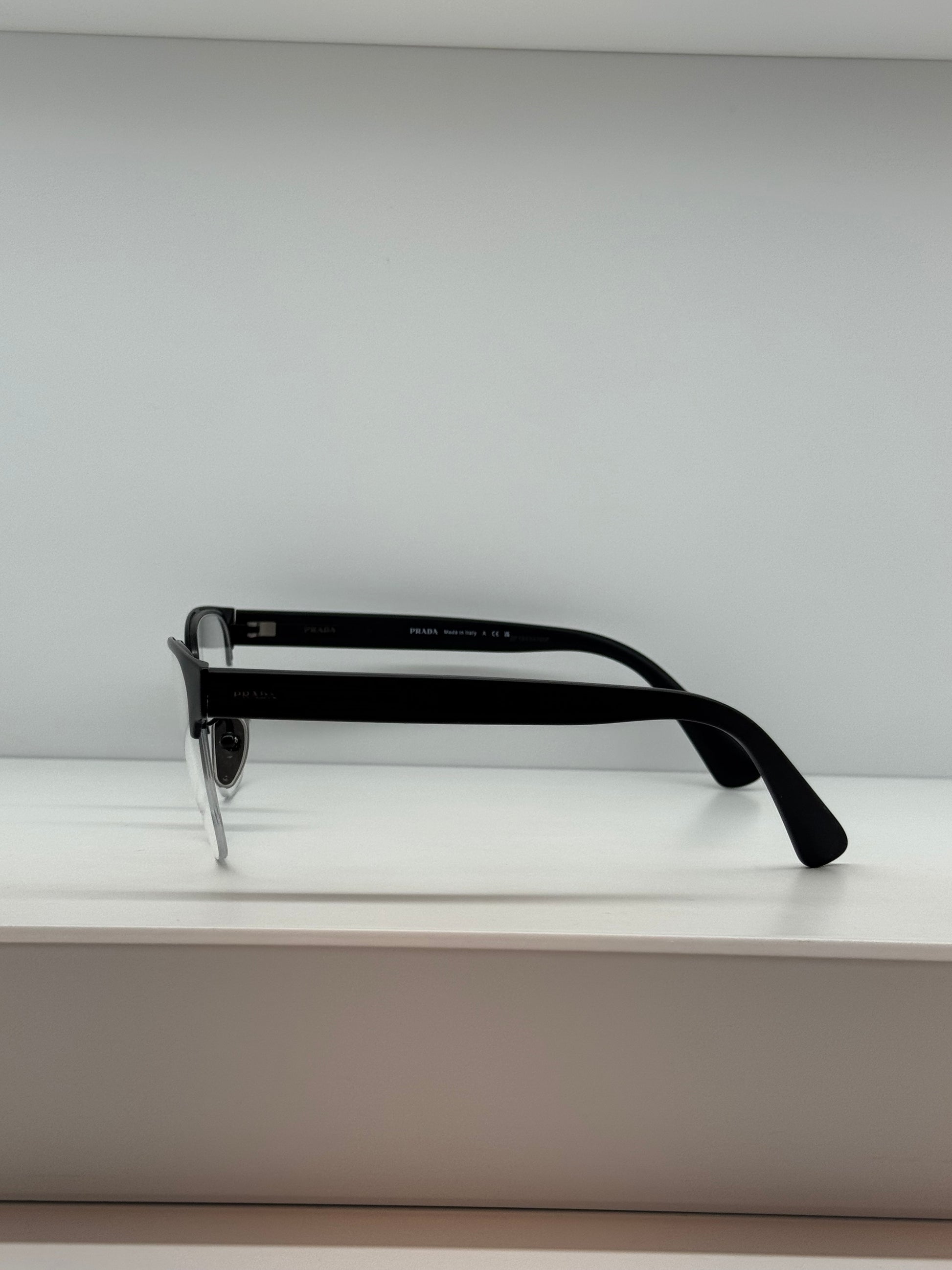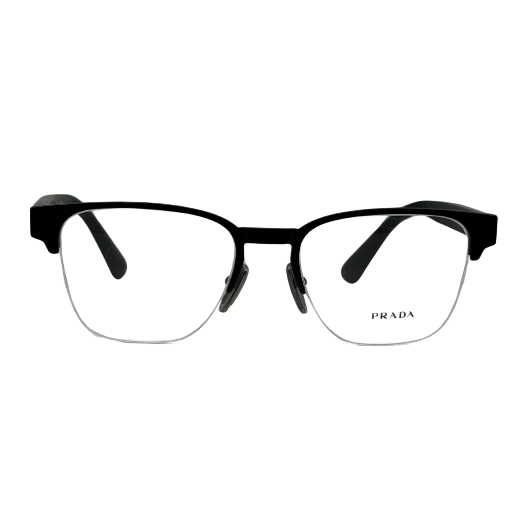 El aro Prada modelo 1B0 en color negro ofrece un estilo sofisticado y contemporáneo, característico de la marca italiana. Su diseño en metal semi al aire aporta ligereza y elegancia, ideal para hombres que buscan una apariencia profesional y refinada sin perder comodidad.